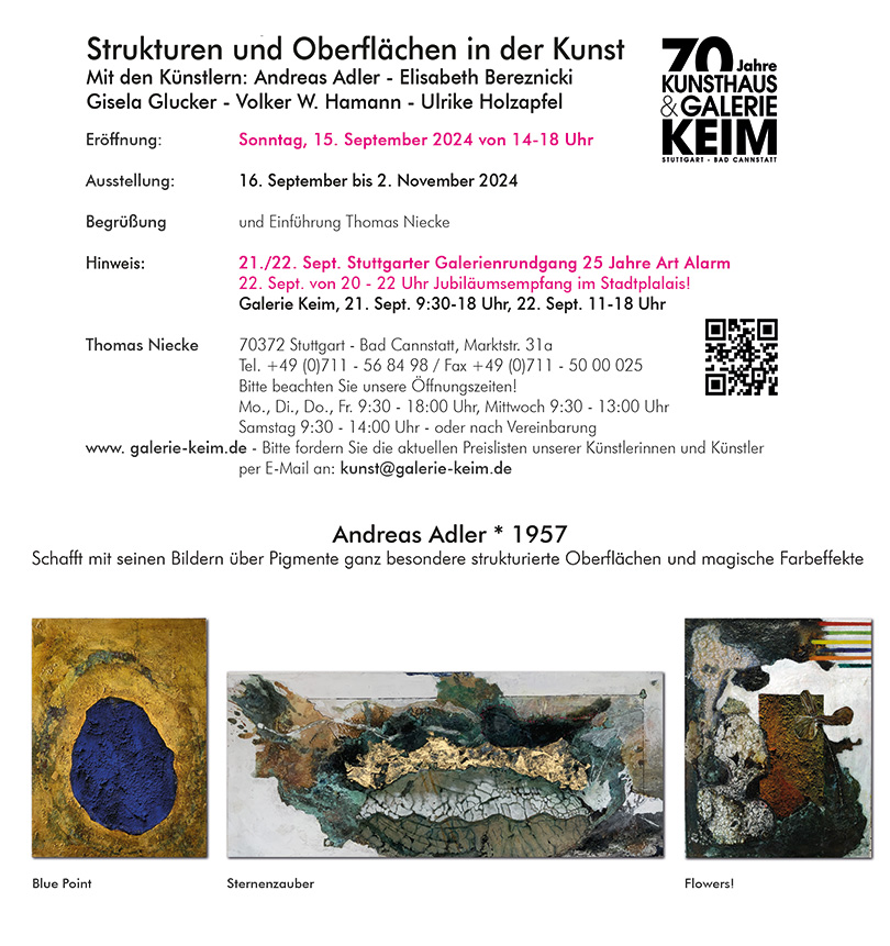 ![]() Strukturen und Oberflächen in10der Kunst 2024 - Galerie Keim 2024 - Galerie Keim |